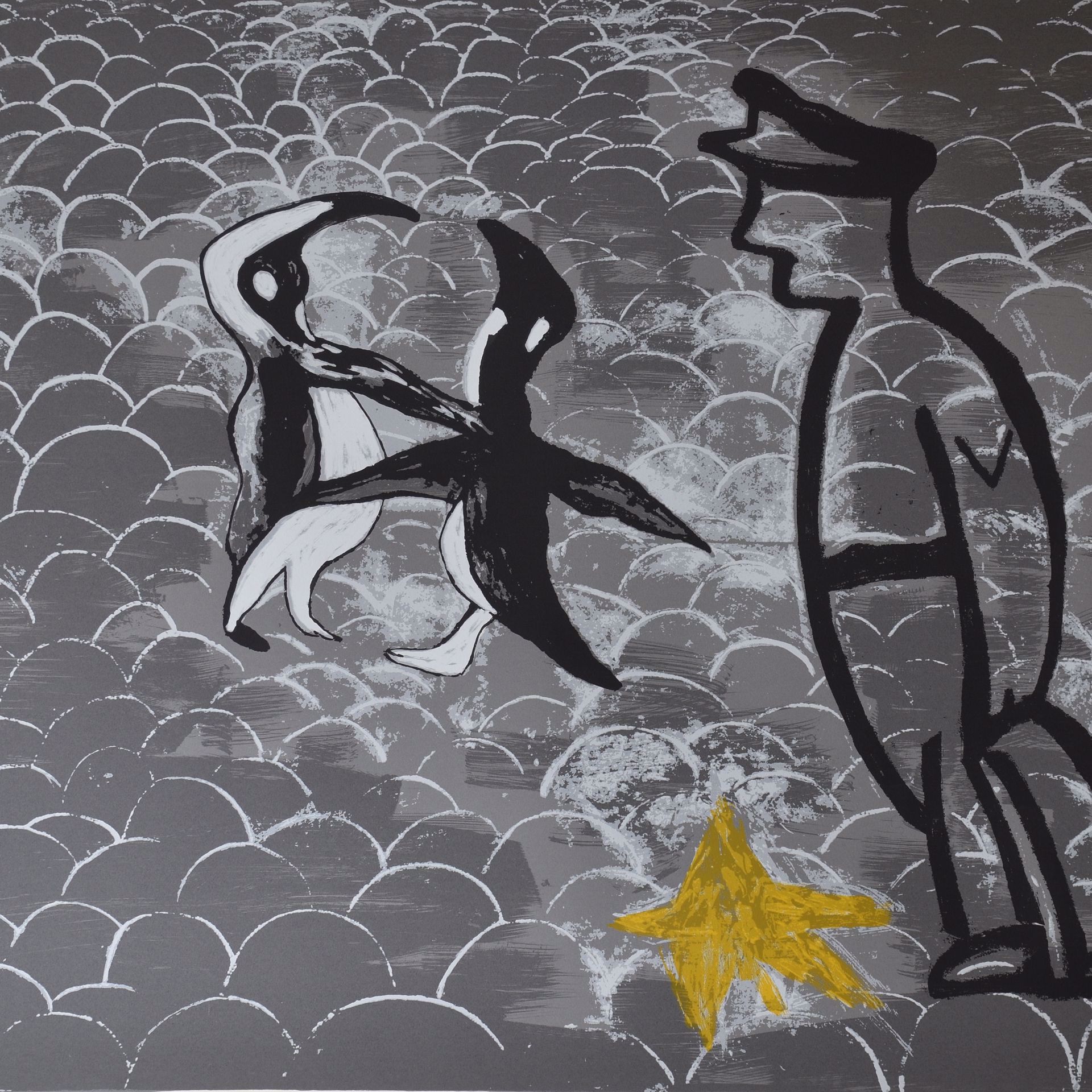 Police officer with penguins. Colour lithograph, signed.