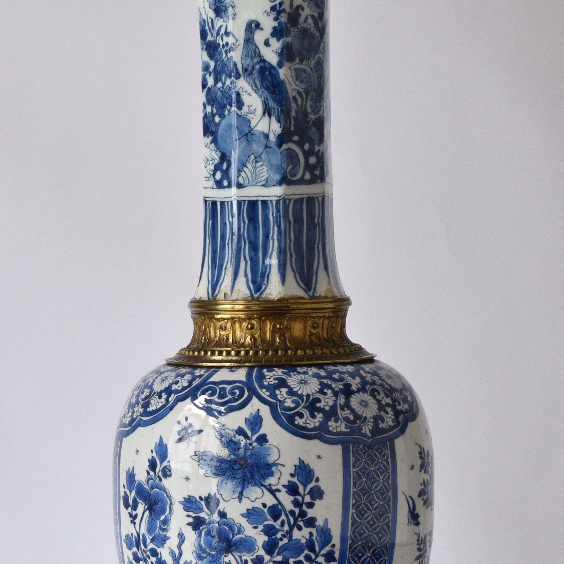three panels decorated with birds and insects among flowering shrubs. China, 19th century. On a copper base and frame; a slender octagonal neck of earthenware with blue decoration. Delft, 18th century.