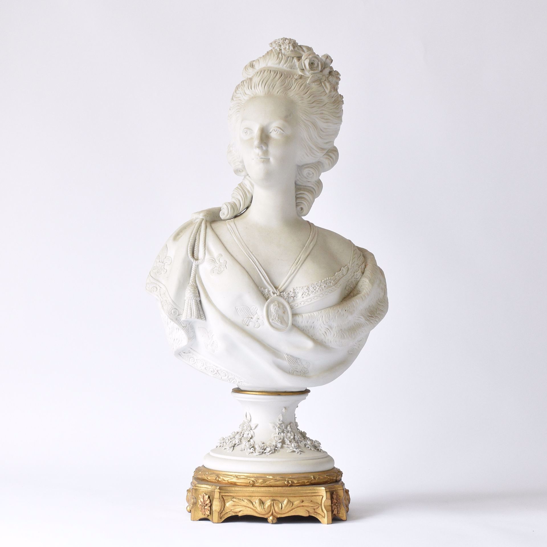 Biscuit porcelain statue on a rising pedestal decorated with floral garlands. Signed: Richelbourg. Marked: Sèvres. H: 50 cm.