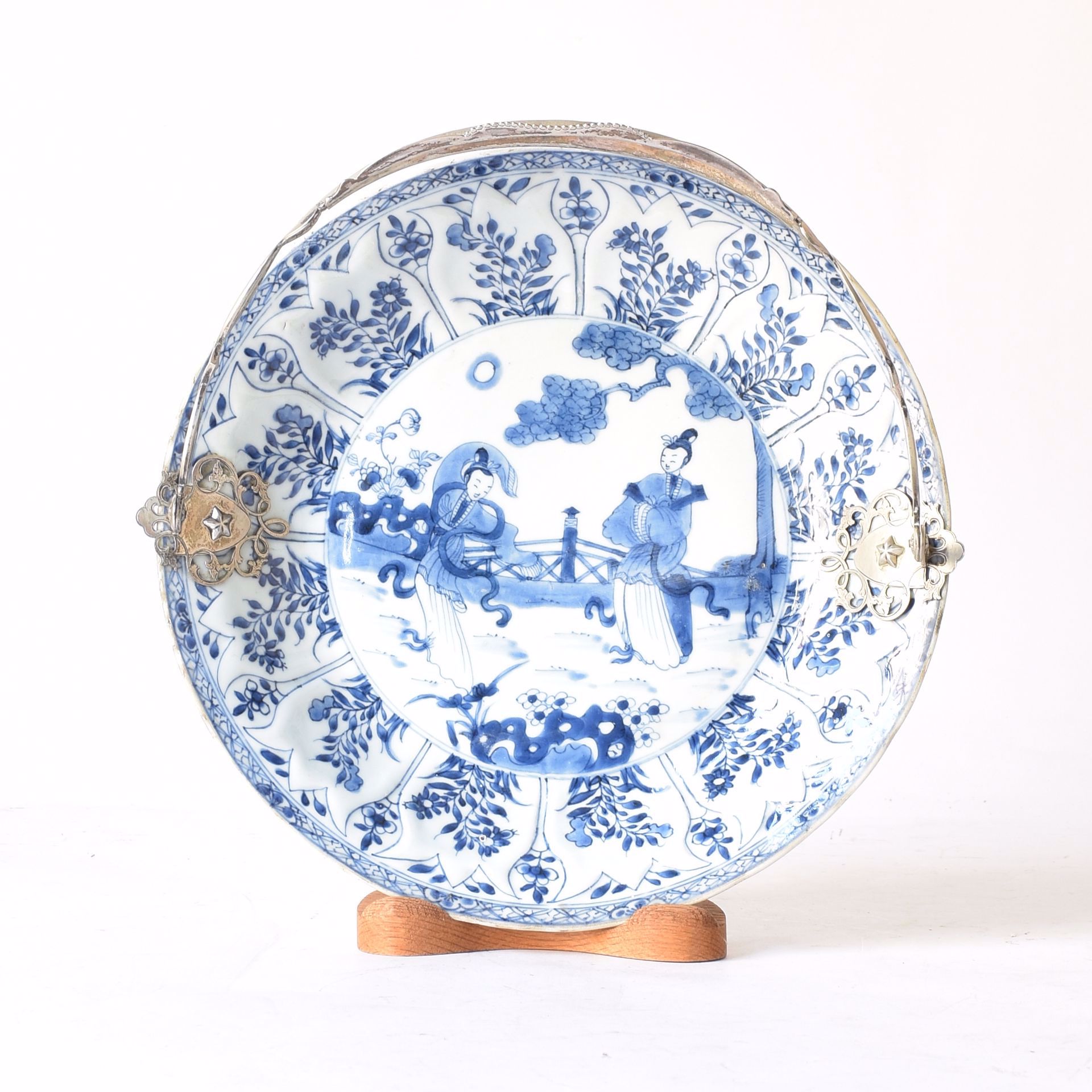 medallion decorated with ladies in garden, surrounded by 12 compartments decorated with flowering branches. Kang-hé period. With silver handle. Dutch hallmarks.