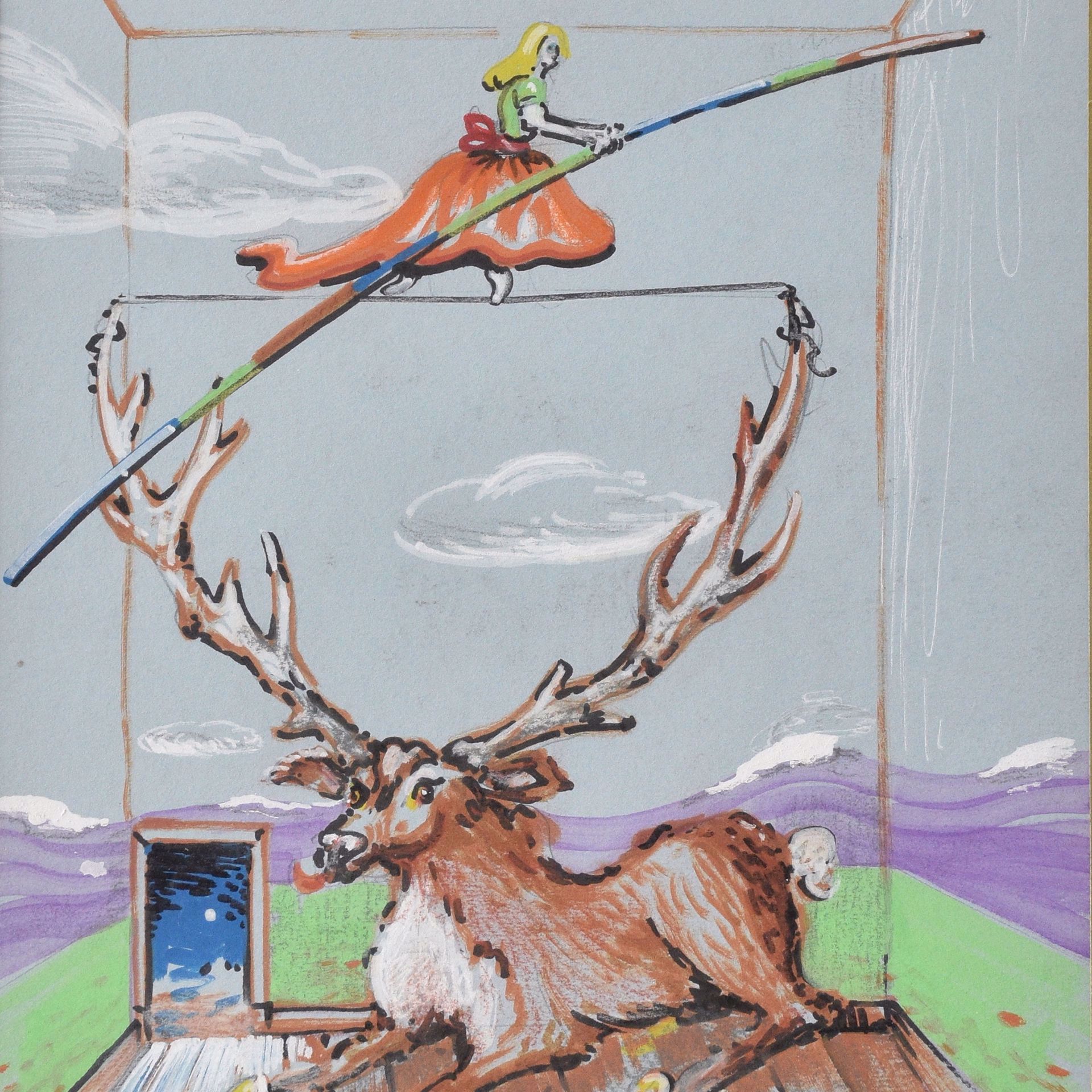 Tightrope walker above deer. Paper, 31.5 x 23.