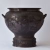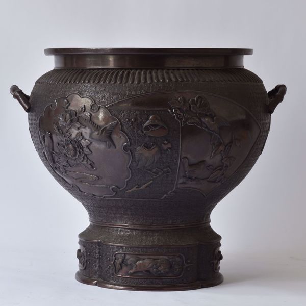 lobed medallions with relief decoration of birds among flowering bush on lobed base decorated with animals. Japan, Meiji period.