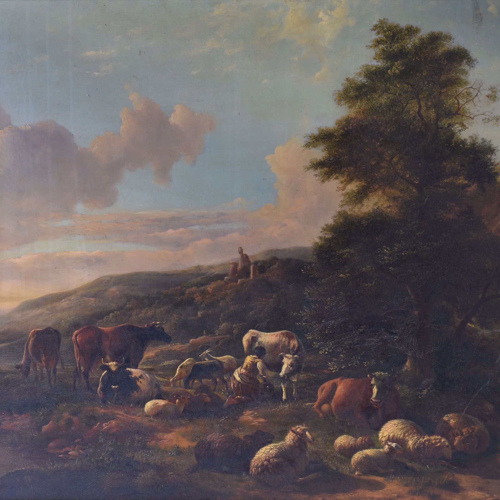 Shepherdess with flock in hilly landscape. Panel, 68 x 93.