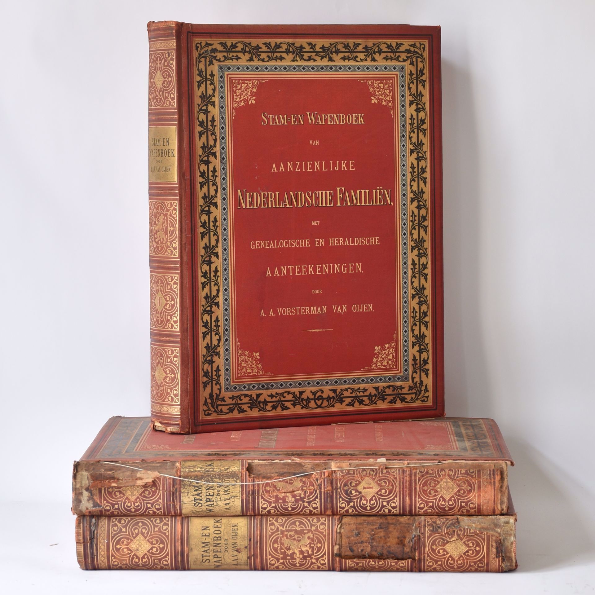 Stam- en wapenboek van aanzienlijke Nederlandsche familiën, met genealogische en heraldische aanteekeningen. 3 volumes in original linen bindings. Folio, 359 + 415 + 502 pp., 104 chromolithographically coloured plates, 624 family coats of arms. Two volumes with damaged spines.