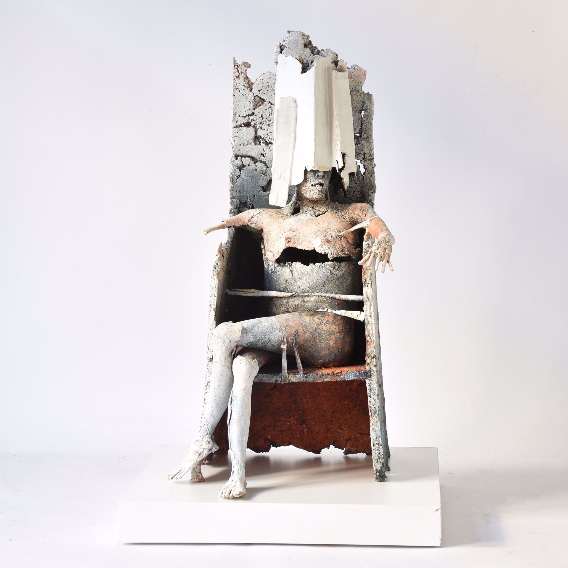 Personnage assis: statue en terre cuite. 50 x 25 x 29. Sur socle en plexiglas.
