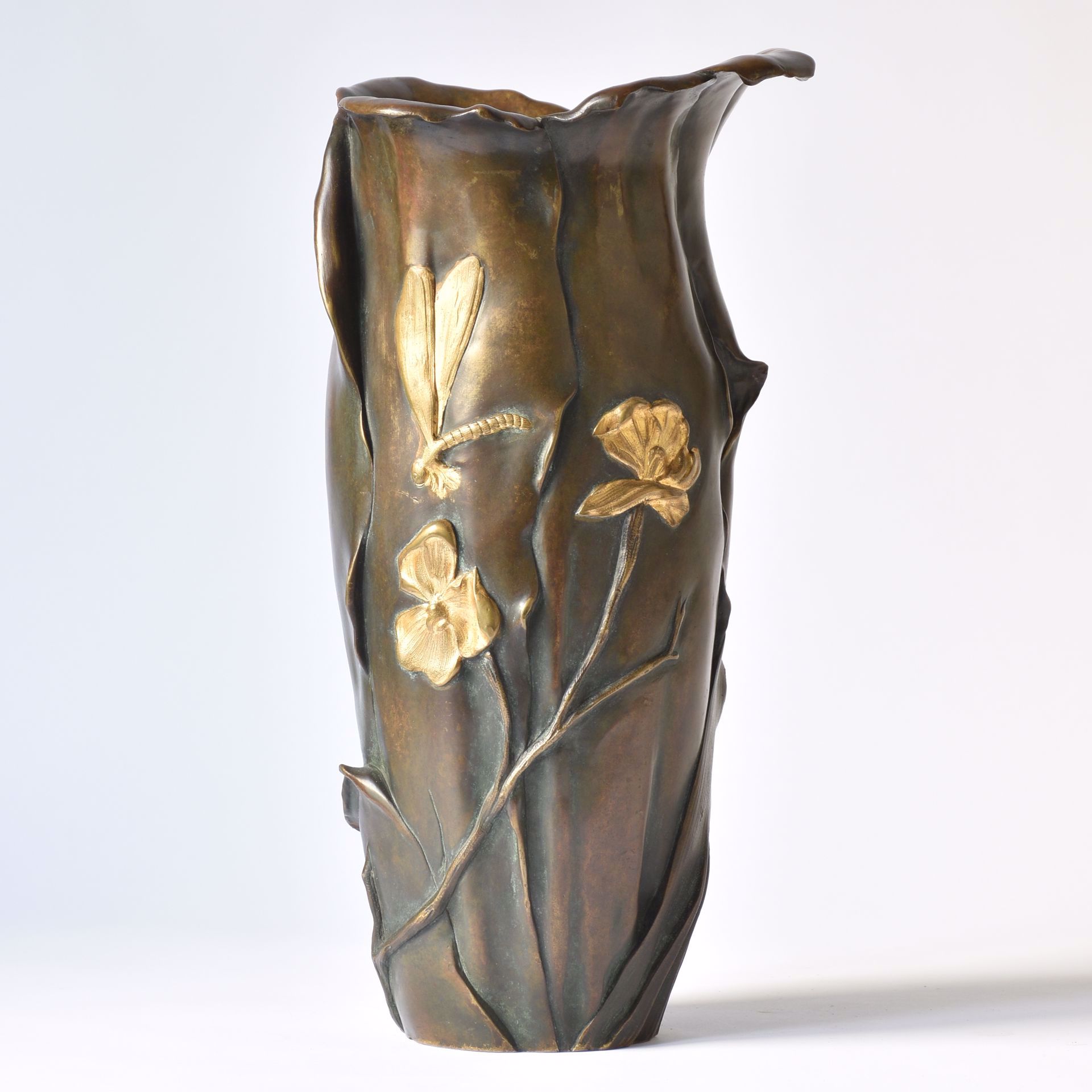 vase en bronze patiné et doré à décor de libellule et de plantes aquatiques. H: 31 cm.