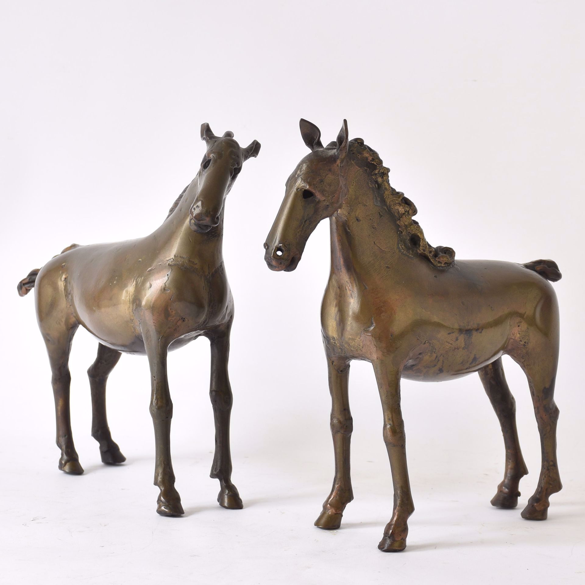Deux chevaux: paire de statues en bronze patiné. H: 26 cm.