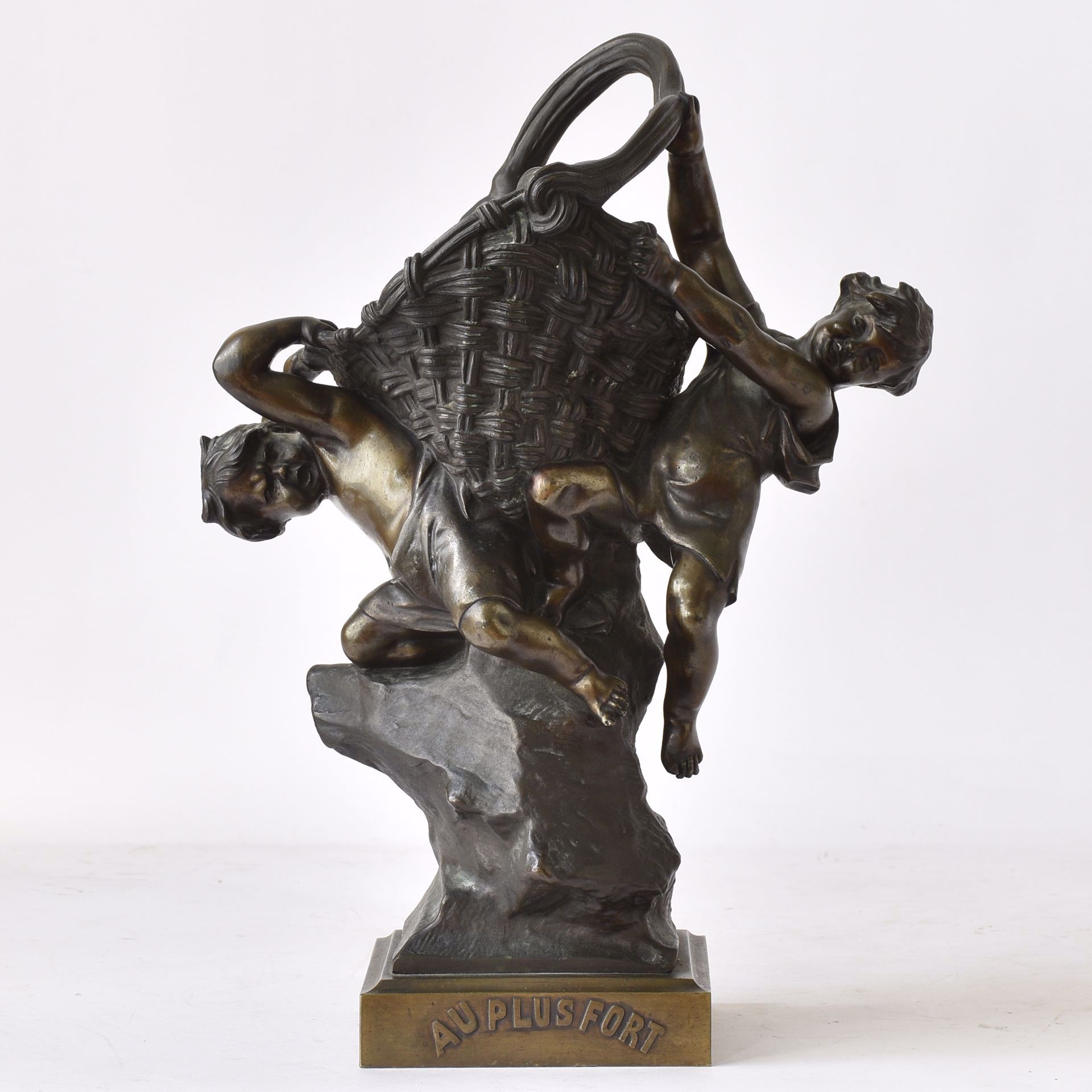 'Au plus fort'. Panier avec enfants jouant: statue en bronze avec patine brune. H: 38 cm.