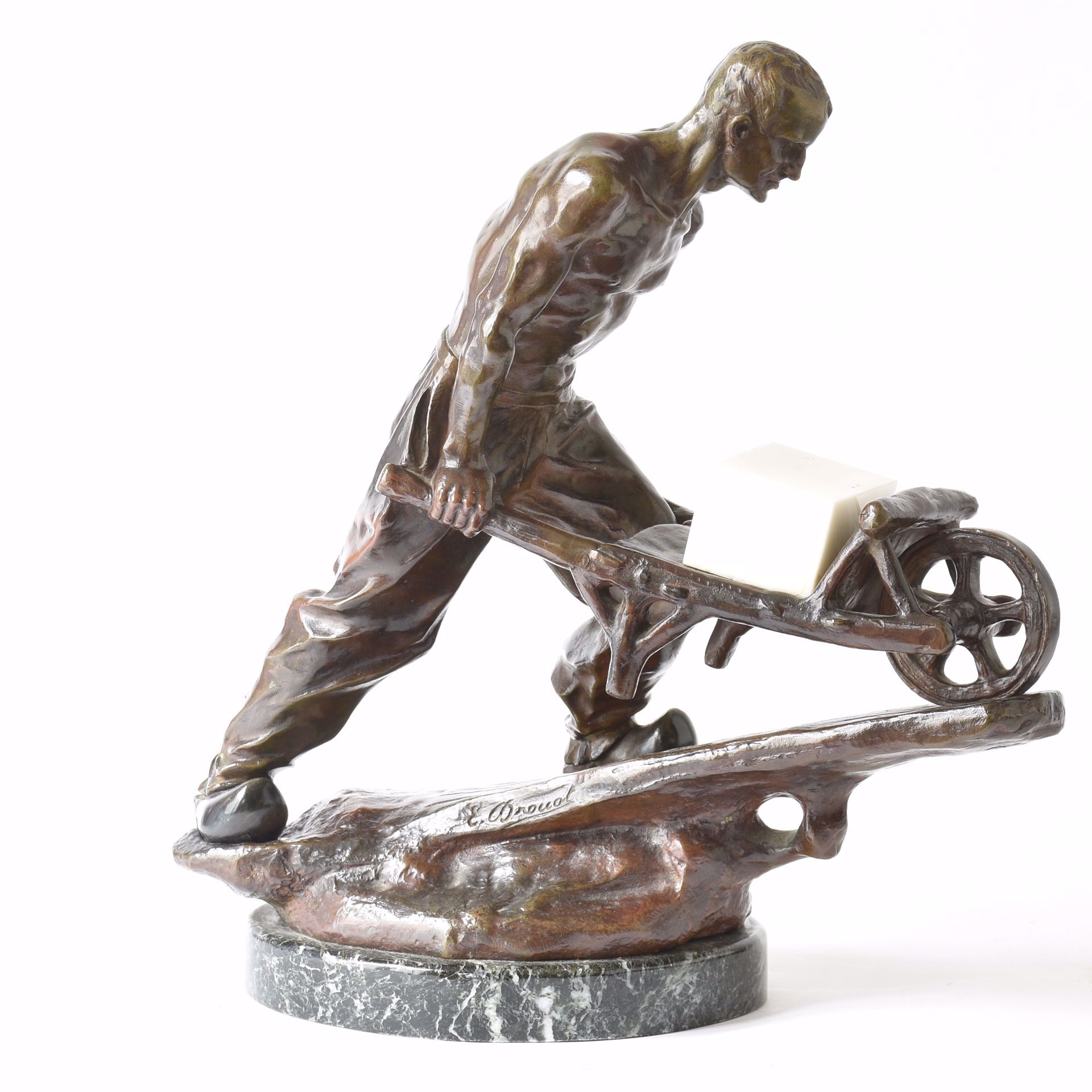 Ouvrier avec brouette: statue en bronze patiné sur socle en marbre vert. 41 x 41 x 19.