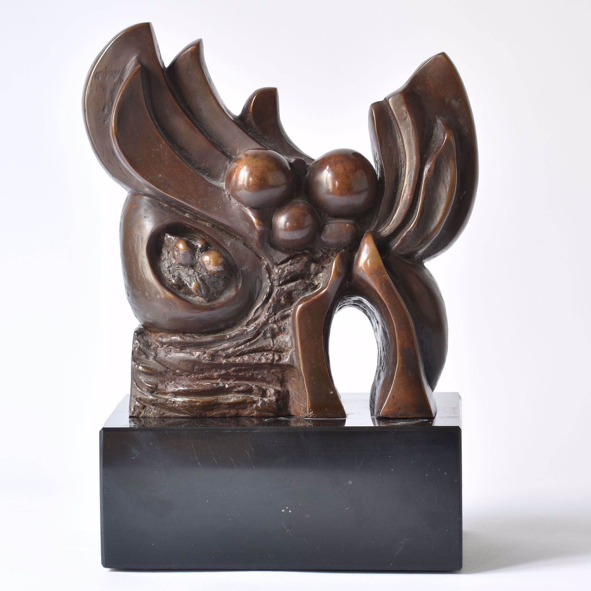 Composition: statue en bronze avec patine brune. 1/7. Signée. 22 x 22 x 9. Sur socle en marbre noir.