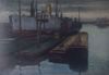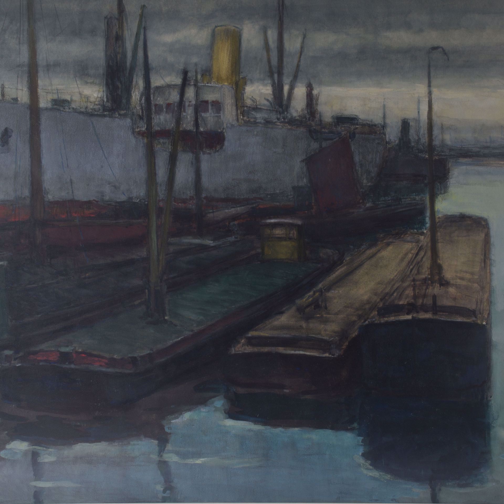 Péniches et navire de mer dans le port d'Anvers. (1935). Papier, 67 x 97.