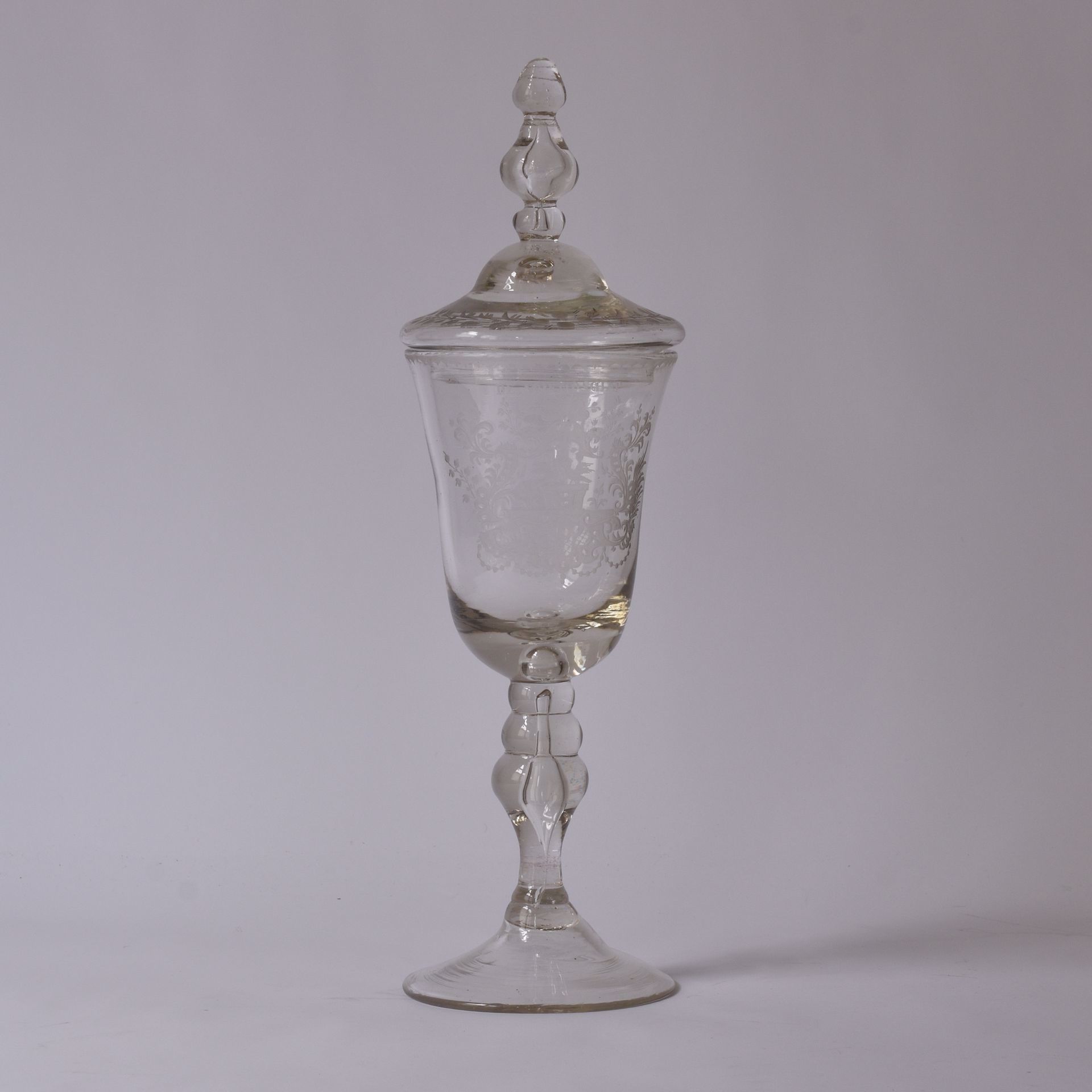 à décor gravé de tourtereaux avec inscription: 'De Vriendschap'; tige avec noeud sur pied rond. Pays-Bas, fin du 18e siècle.