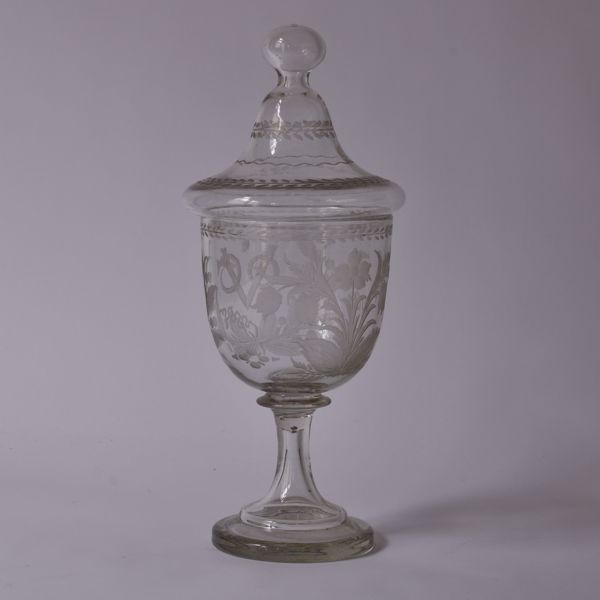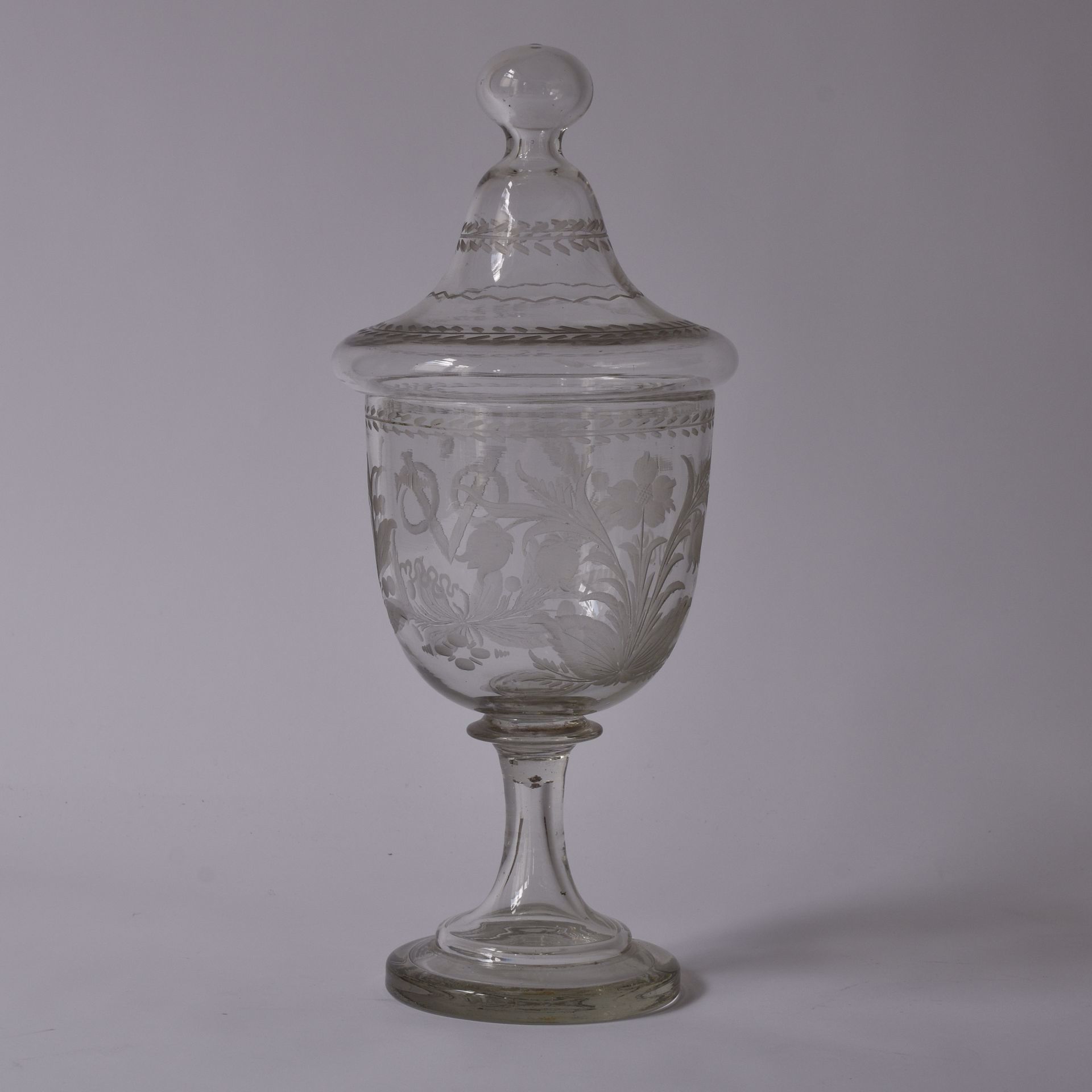 met gegraveerd decor van bloemen en met opschrift: VOC; rond oplopend voetstuk. Nederland, 18e eeuw.