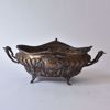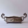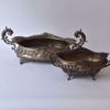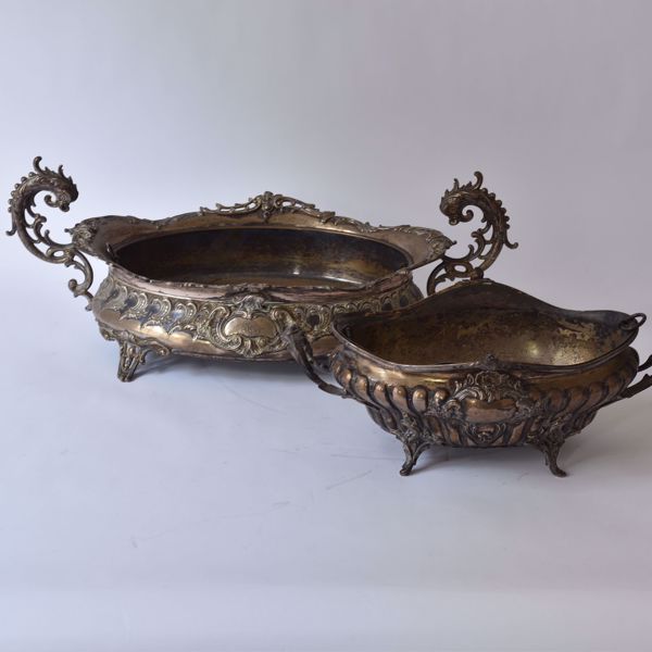 van gedreven zilver; handvatten in vorm van dolfijnen. Duitse merken. En een ander. G: 1180 gr.