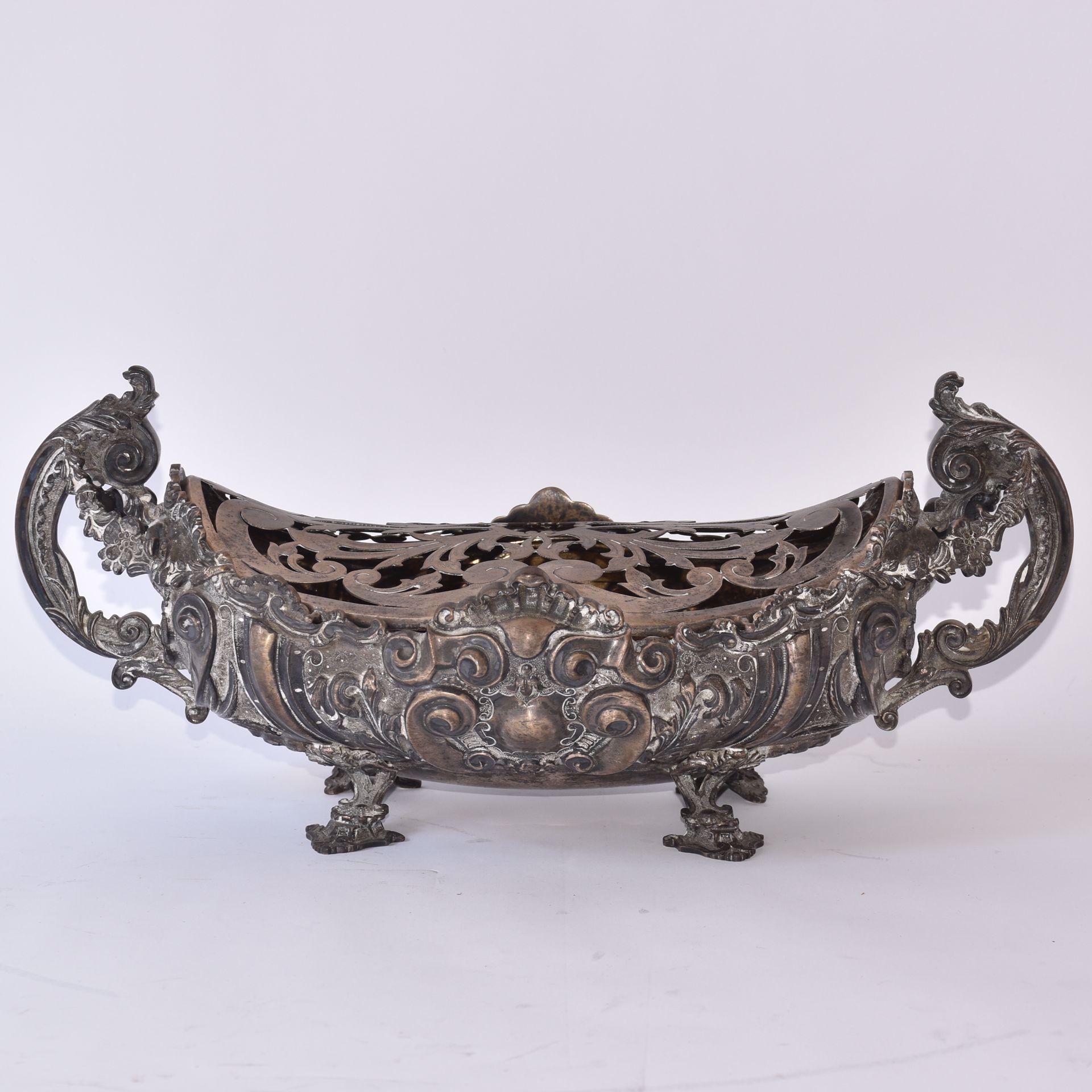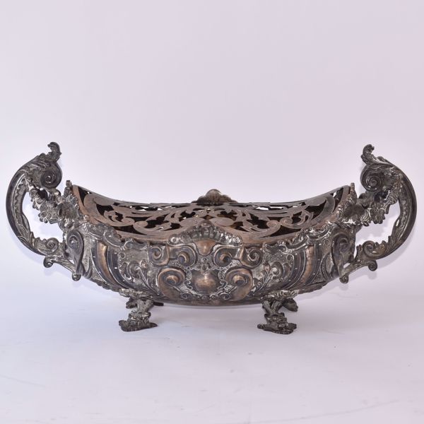 van gedreven zilver bekroond met houder; op vier schelpvormige poten. 833/1000. Merken van Porto. G: 1180 gr.
