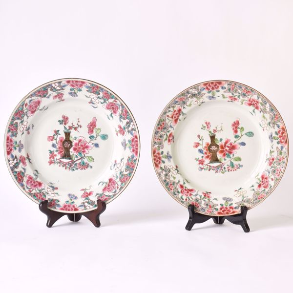 in het plat tuinvaas en bloeiende tak: boord met bloemen versierd. Kien-Long-tijdperk.