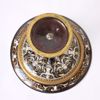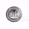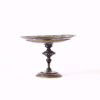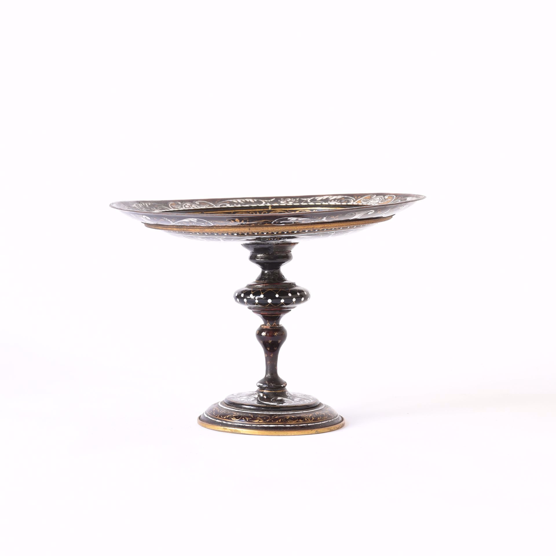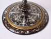 op hoge ronde voet van email: medaillon met decor van vele personages in avondlandschap; boord met amorhoofdjes en ranken versierd. Limoges, 19e eeuw (?). Hersteld. 14 x 20.