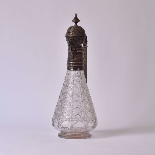 van geslepen kristal met zilveren montuur en handvat versierd met zwaan, gietbek in de vorm van saterhoofd.