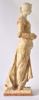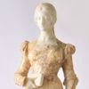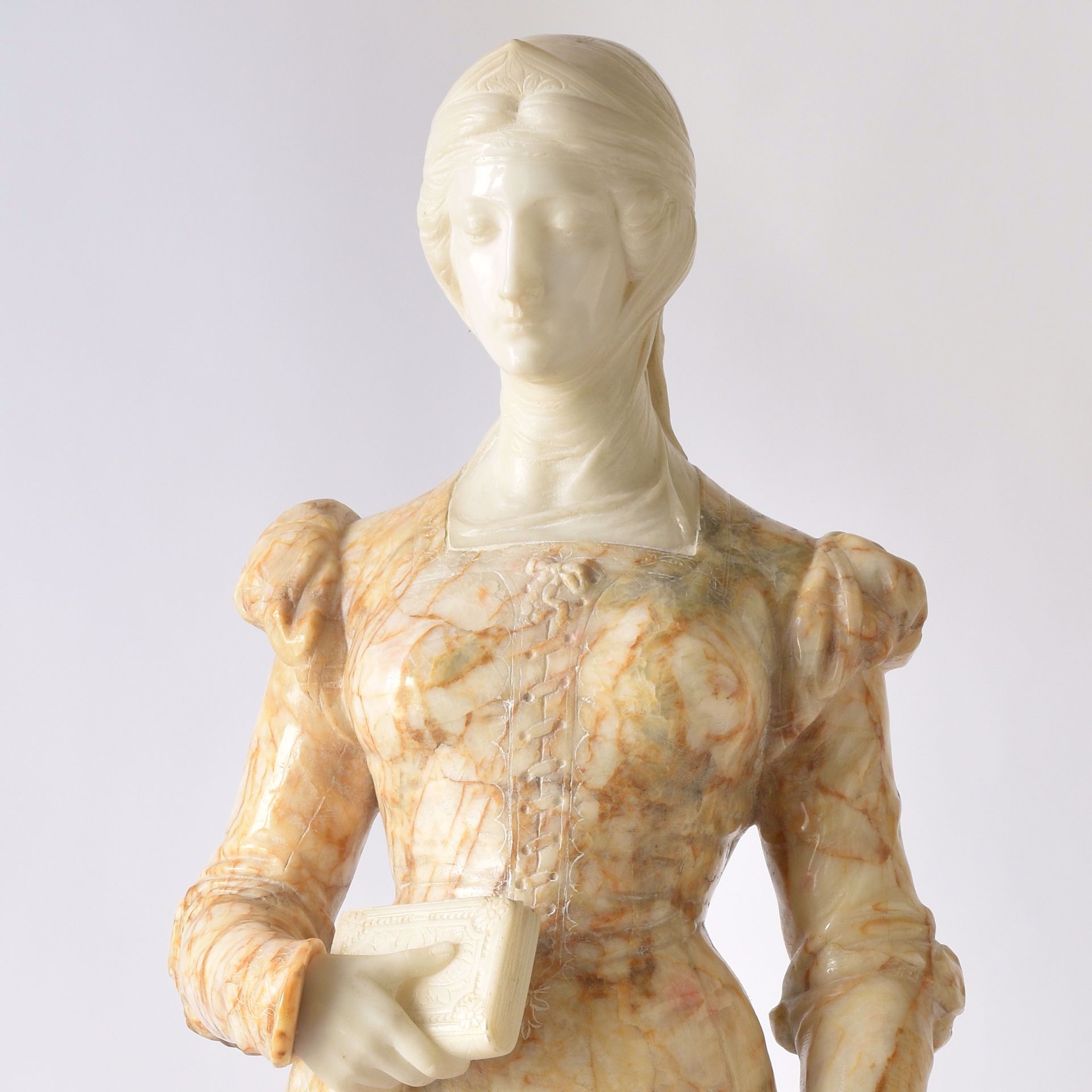 beeld van gehouwen wit en bruin marmer op bruin marmeren voetstuk. H: 80 cm.