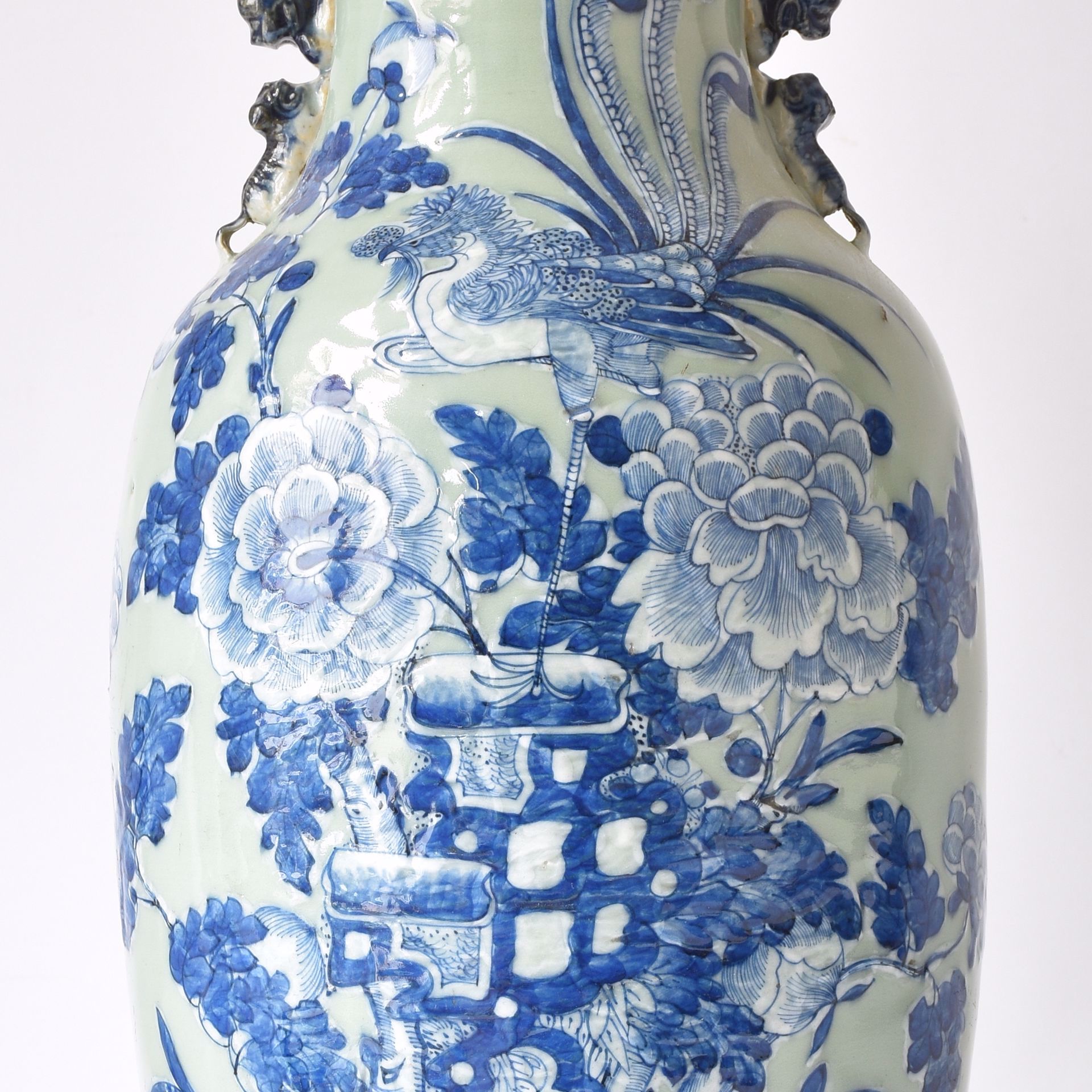 van porselein met blauw decor van paradijsvogel en tuinvaas op celadon fond. China, 19e eeuw.