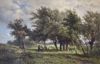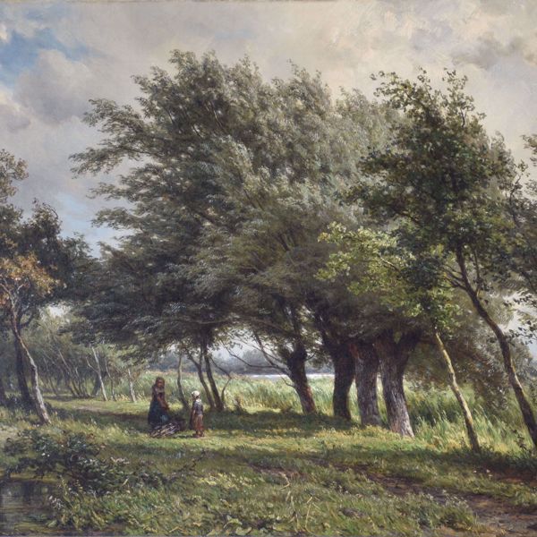 Houtsprokelaars in landschap. Doek, 44 x 69.